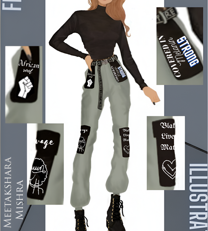 This ensemble blends functionality with activism, featuring cargo pants adorned with hand-painted illustrations in every pocket—each stroke telling a story of resilience and empowerment. Paired with a sleek black high-neck top, it symbolizes strength, unity, and the unapologetic presence of the Black Lives Matter movement.